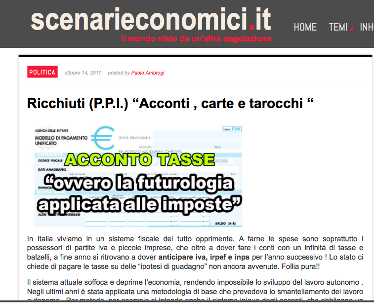 In Italia viviamo in un sistema fiscale del tutto opprimente. A farne le spese sono soprattutto i possessori di partite iva e piccole imprese, che oltre a dover fare i conti con un infinità di tasse e balzelli, a fine anno si ritrovano a dover anticipare iva, irpef e inps per l’anno successivo! Lo stato ci chiede di pagare le tasse su delle “ipotesi di guadagno” non ancora avvenute. Follia pura!!