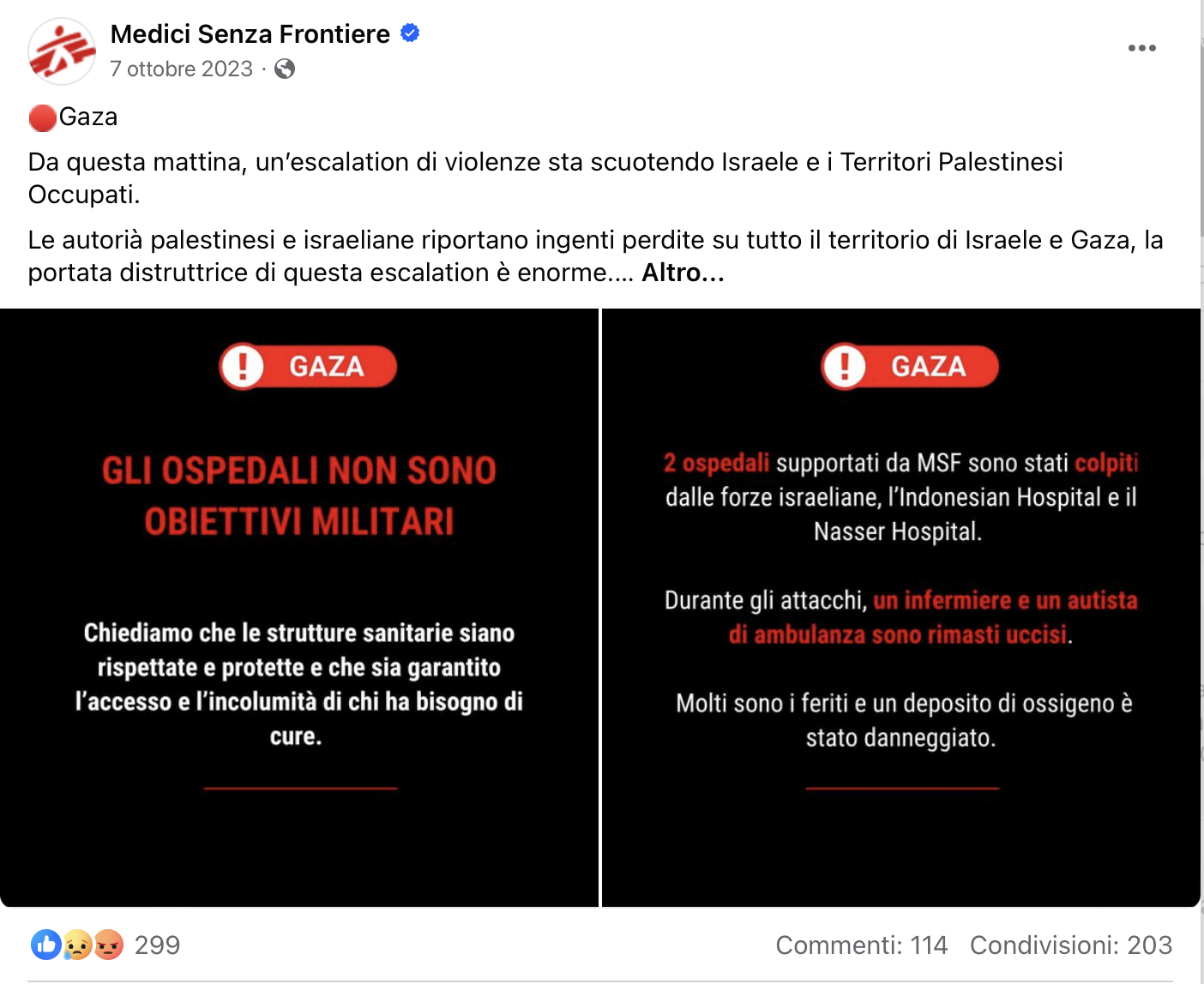 questa mia e per avvisarvi che sulla pagina Facebook della vostra organizzazione permane il post che abbiamo messo in evidenza, datato 7 ottobre 2023 e che racconta una realtà totalmente differente, in maniera quasi paradossale, rispetto agli avvenimenti avvenuti dalla mattina dell’alba di quel giorno fino al pomeriggio inoltrato nella Striscia di Gaza ed in Israele.